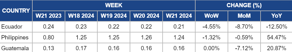 In W21, the wholesale price of bananas in Ecuador decreased by 4.55% week-over-week (WoW) to USD 0.21/kg. Despite a decrease in production, prices declined due to short-term market dynamics, seasonal factors, and long-term trends. Immediate market fluctuations and supply-demand imbalances contributed to the 4.55% WoW decrease. Moreover, the seasonal changes in banana production led to an 8.70% month-on-month (MoM) decrease, while long-term trends, such as changes in production costs or shifts in global trade patterns, resulted in a 12.5% YoY decrease. These factors combined influenced the decline in banana prices in Ecuador.