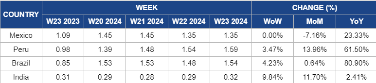 Mango prices in Mexico remained stable at USD 1.35/kg in W23, with a 7.16% month-on-month (MoM) decrease but a notable 23.33% YoY increase. This stability can be attributed to shifts in the mango market. The transition of mango supply from Southern to Central Mexico and production shifts due to weather issues caused mango prices to drop in W22, impacting overall fruit pricing dynamics. These factors led to fluctuations in avocado prices, with shortages in larger fruit sizes and more supply in smaller sizes. Despite the week-on-week (WoW) decrease, the YoY increase in avocado prices indicates a significant market shift compared to the same period in 2023.