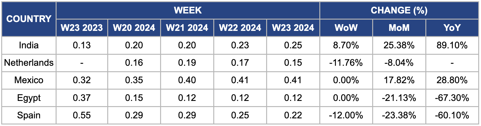 In W23, Mexican onion prices held steady at USD 0.41/kg compared to the previous week. However, there was a substantial YoY increase of 28.8% due to a constrained supply of white and red onion varieties. The market anticipates improvements as the Texas onion season begins. Nevertheless, overall onion supplies continue to be notably lower than last year, prompting importing countries such as Mexico and Canada to procure more than usual in recent months.
