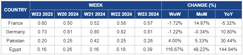 In W23 in the potato landscape, Brazil experienced a significant surge in potato prices, with special agate potatoes in São Paulo reaching USD 38.96/25 kg bag, driven by disruptions in the harvest caused by rainfall, particularly in Paraná's Guarapuava. In Bolivia, potato production saw fluctuations, with Cochabamba and La Paz contributing significantly despite challenges like drought and frost. Egyptian potato prices soared to USD 0.42/kg due to seed shortages and increased cultivation costs, impacting local production cycles and high consumer prices. In Germany, waxy potato prices spiked to USD 1.76/kg in W23 due to weather delays, affecting planting and harvesting schedules. Russia's Astrakhan region tested Belarusian potato varieties for improved yield and climate resilience, aiming to enhance local agriculture. As for the weekly price trend, France saw a minor decline in potato prices to USD 0.57/kg. Pakistan and Egypt also witnessed price fluctuations, with Pakistan's wholesale potato prices rising by 4% WoW to USD 0.26/kg and Egypt experiencing a significant increase of 116.67% WoW to USD 0.39/kg due to reduced availability and high demand, exacerbated by currency devaluation and export dynamics.