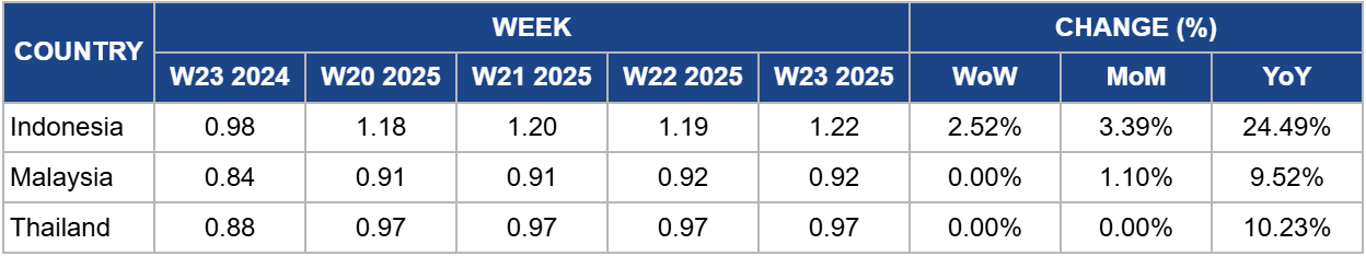 In W23, Thailand's palm oil prices remained unchanged at USD 0.97/kg for the fourth consecutive week, reflecting stable domestic supply-demand dynamics. However, on a YoY basis, prices rose 10.23% from USD 0.88/kg, in line with broader regional trends driven by tighter supply and strong export demand.