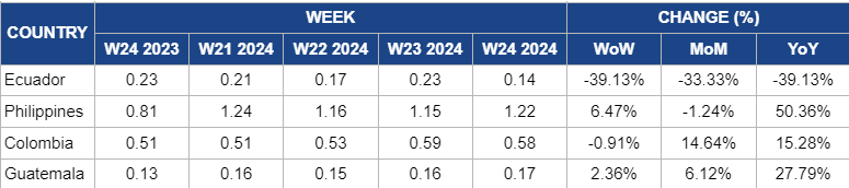 The increase in banana prices in the Philippines in W24, rising by 6.47% WoW to USD 1.22/kg compared to USD 1.15/kg in W23, despite a 1.24% month-on-month (MoM) decrease, is due to the ongoing effects of heatwaves and rainfalls that caused widespread destruction in banana plantations. The YoY increase of 50.36% further underscores the impact of these environmental factors on banana production and supply, leading to the observed price increase in W24.