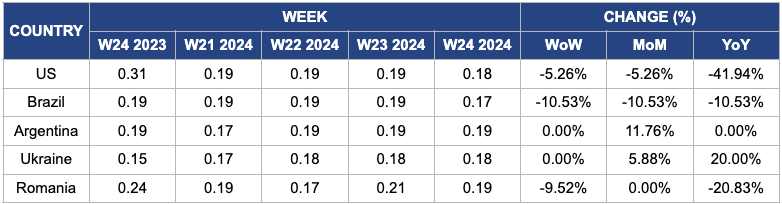 In W24, maize prices in Romania decreased by 9.52% WoW and 20% year-YoY to USD 0.19/kg. Romanian maize production rose in 2023 as yields recovered following a drought-driven drop the previous year.