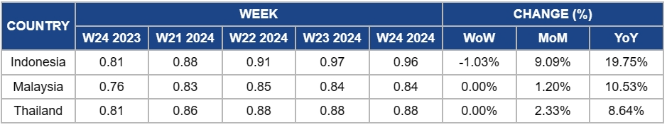 In W24, palm oil prices in Thailand remained unchanged at USD 0.88/kg. However, based on a monthly and yearly comparison, the prices increased by 2.33% MoM and 8.64% year-on-year (YoY). Thailand’s palm oil industry faces stiff competition from Indonesia and Malaysia, leading Thailand to focus on high-value products. Additionally, the EU's environmental and deforestation regulations have compelled the country to upgrade its industry towards pursuing sustainable development.