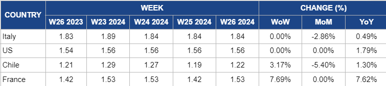 In W26, apple prices in Italy remained steady at USD 1.84 per kilogram (kg), unchanged from W24 prices, with a 2.86% month-on-month (MoM) decrease. This stability is due to balanced supply and demand during the off-season. Despite economic challenges and export restrictions to primary markets like India and Egypt, domestic sales have been consistent.