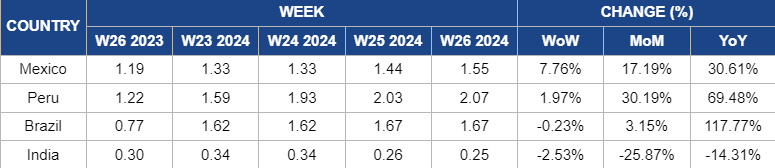 Mango prices in Brazil remained steady at USD 1.67/kg in W26, unchanged from the previous period. However, they have surged by 117.77% YoY, up from USD 0.77/kg in the same period last year. This stability reflects balanced market conditions in W26. At the same time, the significant YoY increase is due to reduced production in major mango-producing countries like Peru, Brazil, and Mexico, coupled with weather-related challenges that impacted yields and quality.