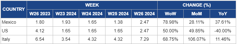 In Italy, strawberry prices surged by 68.75% WoW to USD 7.29/kg in W26, compared to USD 4.32/kg in W25. This dramatic WoW increase is primarily due to a sharp decline in harvest yields from primary strawberry-producing regions. Adverse weather conditions, including unseasonal rainfall and temperature fluctuations, significantly impacted crop quality and reduced overall supply, leading to a sudden price escalation.