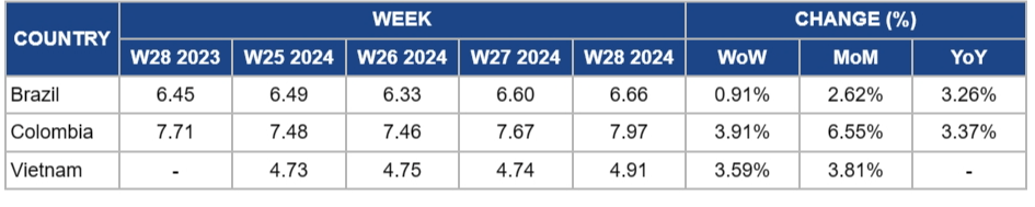 In W28, Brazil's coffee prices increased 0.91% week-on-week (WoW) to USD 6.66/kg after a weekly increase of 4.27% in W28. Brazil’s coffee harvest in the 2024/25 season reached 58% by the first week of Jul-24, surpassing the five-year average of 54% due to dry weather which is favorable for coffee harvest. However, given the global supply shortage due to decreased harvests in Indonesia and Vietnam, coffee prices will likely increase further.