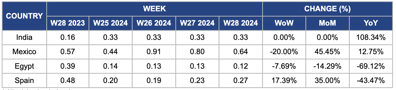 In W28 in the onion landscape, prices in Dhaka, Bangladesh, surged by 33% MoM in Jul-24, driven by India's 40% export duty on onions and recent flooding, which disrupted local vegetable production. India's government has initiated a substantial procurement drive, having acquired 71 thousand mt of onions so far to stabilize the market amid a 20% YoY reduction in production. In Italy, onion prices have recently decreased due to a new campaign boosting supply, although Tropea onion prices remain stable. New Zealand and Indonesia have signed a trade agreement facilitating the export of New Zealand onions to Indonesia without fumigation. As for pricing, Indian onion prices have stabilized in W28 due to increased supply from Rabi onions and ongoing monsoon rains. Mexican onion prices fell 20% WoW to USD 0.64/kg with the onset of local production. Similarly, Egypt's wholesale onion prices decreased to USD 0.12/kg due to high stock levels and a suspension of export permits to Saudi Arabia. Conversely, Spain saw a 17.39% WoW increase in onion prices amid a significant reduction in production and a 45 to 50% drop in the area devoted to onion cultivation.