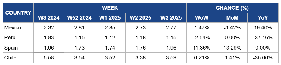 Avocado prices in Spain rose by 11.36% WoW to USD 1.96/kg in W3, with a 13.29% MoM increase. The price increase is driven by strong domestic demand, supported by the AET campaign encouraging consumers to support local avocados for their environmental and economic benefits. Moreover, avocado prices have no YoY change due to improved local production volumes in regions like La Axarquía and the Costa Tropical of Granada, following favorable rains that eased some water scarcity issues. Additionally, competition from imports, particularly from Morocco’s strong harvest, has limited price hikes, maintaining stability in YoY comparisons. However, ongoing concerns over water shortages and production costs continue to influence pricing trends.