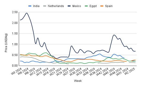 In Mexico, onion prices slightly declined by 1.45% week-on-week (WoW) to USD 0.68/kg in W3, showing an 11.69% MoM decrease and 68.08% YoY decline. The price drop is due to an increase in the supply of onions as the cold weather from previous weeks began to ease, allowing more onions to reach the market. Additionally, the delayed export season, with shipments starting only in mid-Feb-25, has increased domestic availability, contributing to the price reduction. The significant YoY decline reflects the high prices of the previous year when supply was more limited and market demand was stronger.