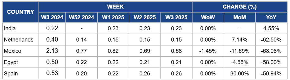 Onion prices in Spain remained steady at USD 0.26/kg in W3, with a 30% MoM increase due to continued export demand and the ongoing transitional period between harvest cycles, which has limited supply. However, there is a significant drop of 50.94% YoY due to the higher availability of domestic onions last year, which has since been depleted as the Spanish onion harvest concluded earlier, coupled with the impact of weather conditions on last season's production, leading to lower YoY prices.