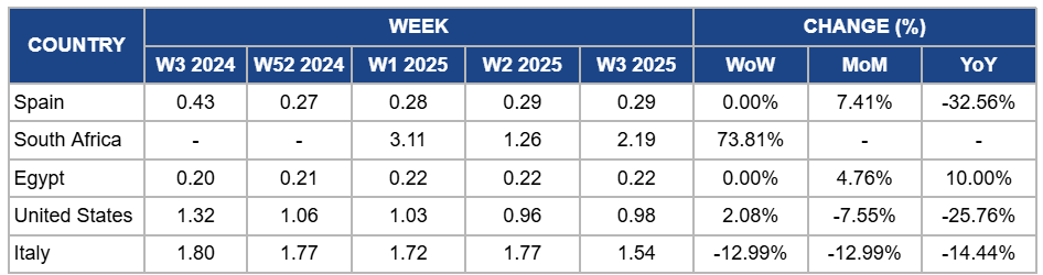 In W3, orange prices in Egypt remained stable at USD 0.22/kg, showing a 4.76% MoM increase and a 10% YoY increase due to strong domestic demand during the peak winter production season and consistent export opportunities to primary markets. Favorable weather conditions have supported high fruit quality, strengthening competitiveness in the international market. Additionally, heightened consumer interest in oranges as a seasonal staple has sustained elevated price levels compared to the previous year, even with high supply ensuring price stability weekly.