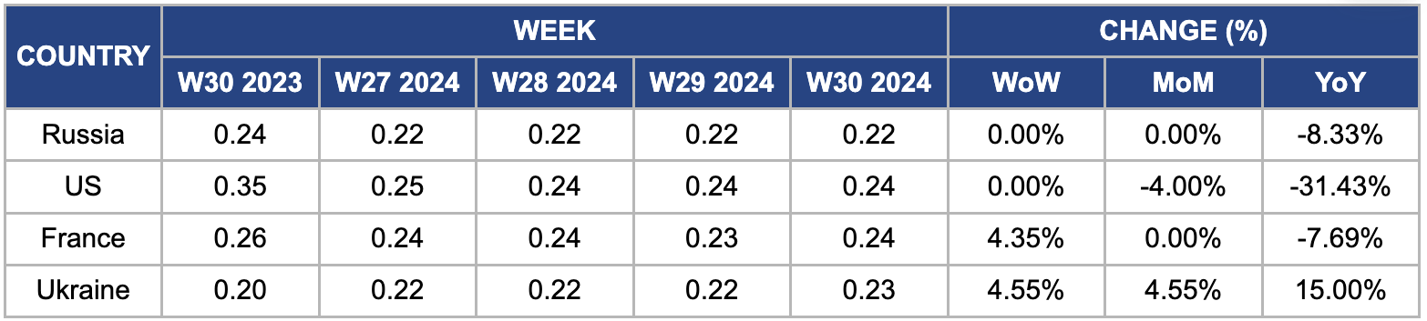 In W30, French wheat prices increased by 4.35% week-on-week (WoW) to USD 0.24/kg from USD 0.23/kg in W29. This increase is due to harvest damage from persistent rain in France in summer. Moreover, French soft wheat ratings fell again in the week to July 22, with only 50% in good or excellent condition, down from 52% the previous week, and harvesting remains well behind average, reducing yield. The latest estimates for this campaign's soft wheat output are between 26.2 and 29.5 mmt, compared to 35.2 mmt in 2023.