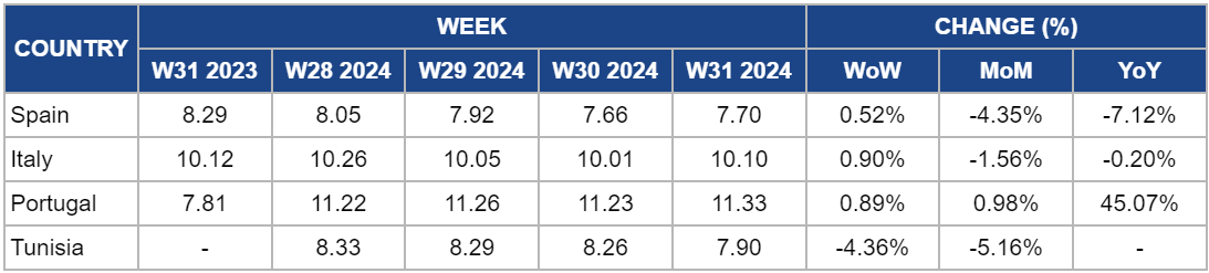 In Tunisia, the price of olive oil was USD 7.9/kg in W31. Since 2006, Tunisia has been improving its capacity in the oil packaging sector by creating a specific fund for this industry, which has supported the exports. As of Jun-24, the country’s olive oil exports surged by 80% YoY in the 2023/24 season. Although Tunisia has maintained this stability over the past couple of months, the drought in Italy and low inventory in Spain could increase prices due to the high global demand for olive oil.