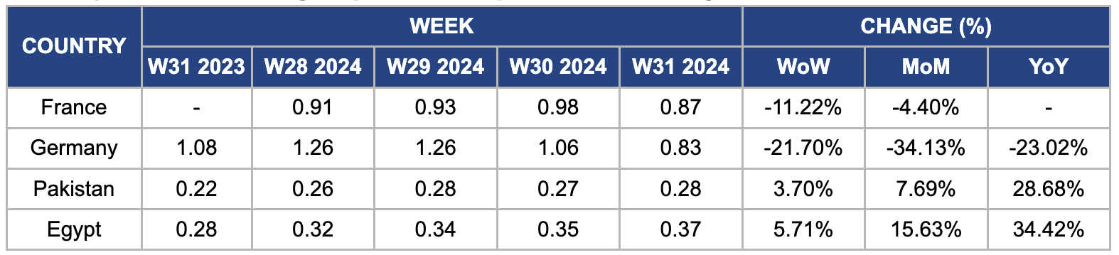 In W31, the wholesale price of French potatoes decreased by 11.22% week-on-week (WoW) to USD 0.87/kg, down from USD 0.98/kg in W30, reversing the previous week’s increase. This is due to a drop in export demand across Europe after recent price hikes, although domestic demand remains solid in France for high-quality potatoes. Early crop planting has been delayed due to very wet soil conditions, though progress has improved in South West France.