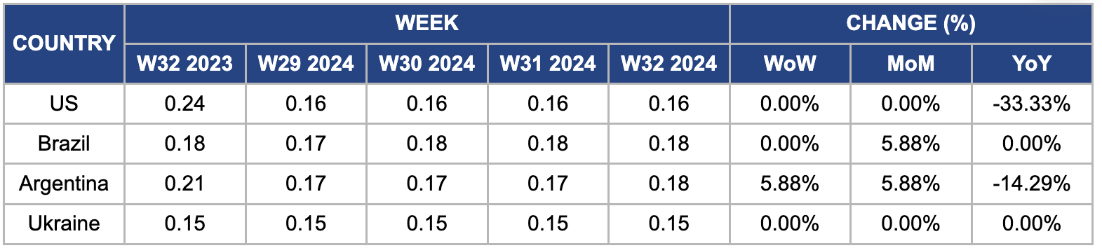 In W32, wholesale maize prices in the US remained steady at USD 0.16 per kilogram (kg), but marked a 33% YoY decrease from USD 0.24/kg in W32, 2023. This price drop is due to favorable weather conditions in the corn belt, including cool, rainy weather, improving supply outlooks. Analysts forecast a slight increase in US corn production to 15.112 billion bushels for 2024, despite expected reductions in planted and harvested area due to adverse conditions.