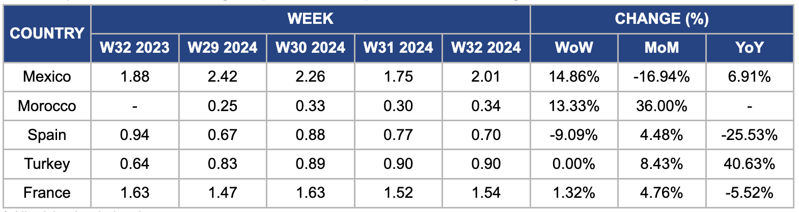 In W32, Mexican wholesale tomato prices rose by 14.86% week-on-week (WoW) from USD 1.75/kg to USD 2.01/kg, the highest price among the compared countries. This surge is due to a drop in local production caused by heat, adversely affecting crop yields. Although regional tomato and vegetable production typically stabilizes prices, higher temperatures are expected to increase prices by the end of June or early July due to reduced crop yields. The heat impedes tomato plant development, causing crops to burn and resulting in a shortage of regional produce. Additionally, inflation has contributed to the increase, as reflected in the National Consumer Price Index (INPC) results released by the National Institute of Statistics and Geography (INEGI) on July 24, 2024.