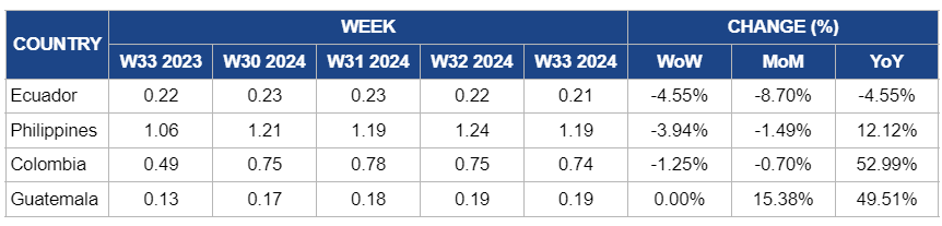 Guatemalan banana prices remained steady at USD 0.19/kg in W33, with a 15.38% MoM and a 49.51% YoY surge. This price stability reflects a temporary balance between supply and demand in Guatemala despite continued global demand and logistical challenges. While the peak harvest season has moderated further price increases, the sustained YoY growth highlights the ongoing pressure from international market dynamics and export costs, which continue to affect regional banana pricing.