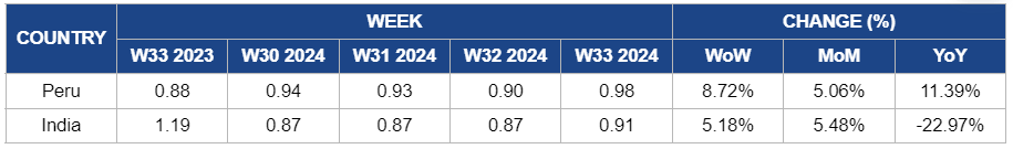 In Peru, grape prices increased by 8.72% week-on-week (WoW) to USD 0.98/kg in W33, compared to USD 0.90/kg in W32. There is also a 5.06% month-on-month (MoM) increase and an 11.39% YoY increase. This increase is due to adverse climatic events and frosts that have reduced grape production in the Southern Hemisphere, which impacted supply.. Additionally, disruptions in maritime traffic through the Red Sea led to increased transit times, compounding supply challenges. Despite these issues, strong demand for grapes has further supported the price increase.