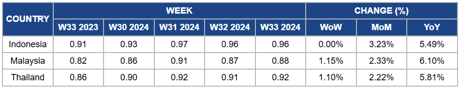 In W33, Malaysia's palm oil prices increased by 1.15% WoW to USD 0.88/kg, compared to USD 0.87/kg in W32, with the MoM and YoY prices increasing by 3.23% and 5.49%, respectively. This price rise is due to concerns about Indonesia's production and Malaysia's falling inventory. However, according to independent inspection company AmSpec Agri Malaysia, the country's palm oil exports declined 22.3% MoM in the first half of Aug-24, putting downward pressure on the prices. In addition, the demand from India and China will continue to influence local prices.
