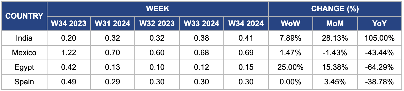 In W34, Egypt's wholesale onion prices surged by 25% WoW to USD 0.15/kg from USD 0.12/kg in W33. Despite this recent increase, prices remain the lowest compared to India, Mexico, and Spain. The current prices are still significantly below the USD 0.42/kg peak recorded in W34 2023. Moreover, YoY prices have dropped sharply by 64%, mainly due to the severe devaluation of the Egyptian pound (EGP) against the United States dollar (USD). In Sep-23, prices tripled to USD 0.74/kg, leading Egyptian officials to stop onion exports temporarily, attributing the spike to traders. However, onion growers have linked the price rise to a heat wave that reduced the harvest and increased production costs.