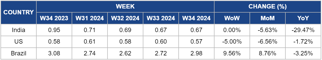 Peanut prices in India remained unchanged week-on-week (WoW) at USD 0.67 per kilogram (kg) in W34, making a 4.63% month-on-month (MoM) and a 29.47% YoY drop.The downward pressure on prices is attributed to the increased supply from the new harvest and high inventory from the 2023 crop. However, prices have stabilized following the Gujarat government’s decision to purchase 100 thousand mt of peanuts. Additionally, heavy rainfall in Uttar Pradesh has caused considerable damage to the peanut crops, leading to uncertainties in the country’s total peanut outputs.