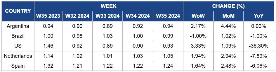 Brazil’s soybean oil prices declined by 1.0% WoW to USD 0.99/kg in W35, compared to USD 1/kg in W34 due to currency fluctuation. The MoM increased by 1.02% from USD 0.98% in W32, while the YoY prices dropped 1% YoY from USD 1/kg in W35 2023. Brazil’s soybean oil exports are expected to decline in the coming years due to rising domestic demand for biodiesel. In particular, in the 2024/25 season, Brazil’s soybean oil exports fell by 22% YoY. This trend will likely continue affecting the export market, especially for India. During the 2023/24 season, 21.2% of India’s soybean oil imports came from Brazil. As Brazilian exports decline, India may need to look for alternative trading partners.
