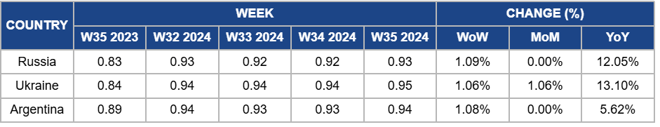 In W35, Argentina's sunflower oil prices increased by 1.08% WoW to USD 0.94/kg compared to USD 0.93/kg in W34. The MoM remained unchanged, and the YoY price increased by 5.62%. The price increase is due to lower production estimates for the 2024/25 season and strong demand from the biofuel sector. Additionally, recent rainfall has delayed the country’s sunflower planting campaign, with the cultivation area for this season projected at 1.85 million hectares (ha).