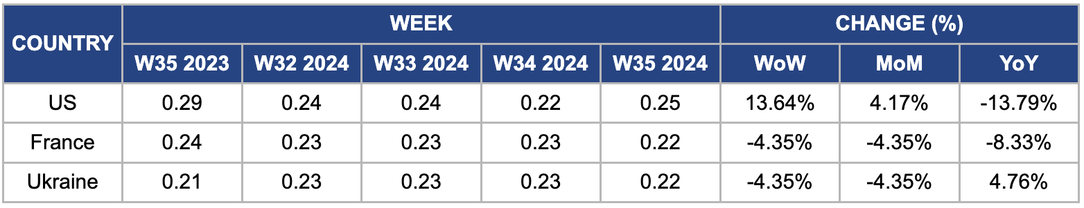 In W35, US wheat prices rose by 13.64% week-on-week (WoW) to USD 0.25 per kilogram (kg) from USD 0.22/kg, although they are still 13.79% lower YoY. A rebound in US wheat exports drives this increase forecasted to exceed 1 mmt in the 2024/25 marketing year (MY) following a historical low in 2023/24. The improved price competitiveness of US wheat, particularly Hard Red Winter, is a crucial factor, as it is now trading at a smaller premium or even a discount compared to other major exporters. Additionally, the US is expected to have a larger crop and robust stocks, contributing to the current price fluctuations. As a result, US wheat prices are better positioned to compete globally and regain market share.