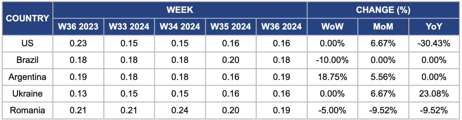 In W36, Romanian maize wholesale prices dropped by 5% WoW and 9.52% MoM and YoY, reaching USD 0.19/kg. This decline is attributed to lower production estimates for the new crop, as dry weather since early July 2024 has negatively impacted yields. Market participants predict a 10 to 15% reduction in production for the upcoming Oct-24 to Sept-25 season, leading to expectations of tighter supply conditions. Combined maize production estimates for Romania and Bulgaria have decreased by 4.5 mmt for this period.