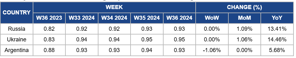 In W36, Argentina’s sunflower oil prices decreased by 1.06% WoW to USD 0.93/kg compared to USD 0.94/kg in W35. The MoM remained unchanged, and the YoY price increased by 5.68%. Sunflower oil prices have been affected by intense competition from soybean and rapeseed oils, putting downward pressure on prices. In addition, the country’s sunflower crushing from Jan-24 to Jul-24 reached 2.35 mmt, marking the third-highest volume of the decade for the same period. The abundant supply has further contributed to the decline in prices.