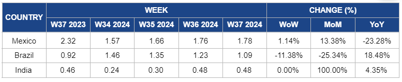 In Brazil, mango prices declined by 11.38% WoW to USD 1.09/kg in W37, with a 25.34% MoM decrease. This is due to a continued rise in domestic supply as the harvest season advances, alongside weakening export demand from key markets. Major producing regions, such as the São Francisco Valley, are experiencing peak production, further adding to the downward pressure on prices. However, YoY prices increased by 18.48% due to last year’s lower production levels, which were affected by unfavorable weather conditions, leading to reduced supply and more robust export demand in W37 2023.