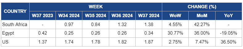 In W37, South African orange prices stood at USD 1.38/kg, reflecting a 4.55% WoW increase and a 42.27% month-on-month (MoM) rise. This continued price increase is due to ongoing effects from earlier supply shortages and the delayed impact of adverse weather conditions. Additionally, the rise in prices is influenced by the recent EU reports of increased citrus black spot cases from South Africa, which have heightened concerns about phytosanitary risks and may impact export volumes. The heightened scrutiny and potential trade restrictions could limit supply, contributing to the upward pressure on domestic prices.