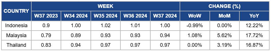 In W37, Indonesia’s palm oil prices decreased by 0.99% week-on-week (WoW) to USD 1 per kilogram (kg), reflecting a year-on-year (YoY) increase of 12.22%. The MoM prices remained unchanged. The WoW price decline is due to the weak demand from the export markets. In addition, India’s decision to increase import duty on palm oil is expected to reduce its palm oil imports, which may hurt Indonesia’s exports. However, the decreased production due to insufficient rainfall in key palm-growing regions during Jul-24 and Aug-24 prevented the price from dropping further.