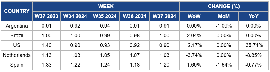 In W37, Argentina’s soybean oil price remained flat at USD 0.91 per kilogram (kg). This stability is attributed to Argentina’s solid production outlook, with soybean production expected to increase by 4.1% YoY in the 2024/25 season. Despite this weekly stability, Argentina faces challenges from high inflation and a depreciated currency, which have reduced export revenues from soybeans and soybean oil. These economic pressures may hinder processors’ ability to operate efficiently, potentially affecting future production and processing activities.