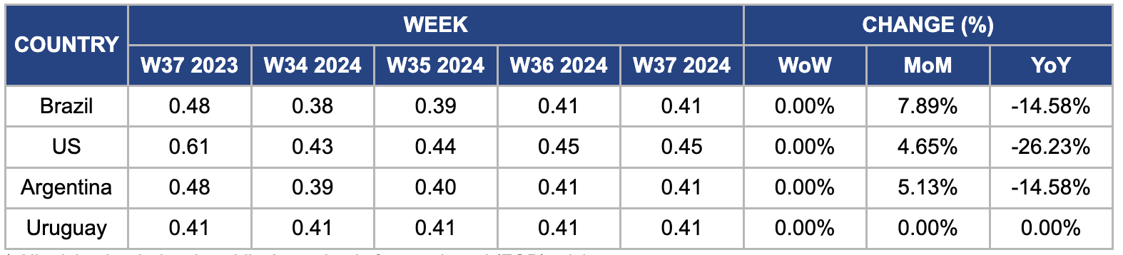 Uruguayan soybean prices held steady both WoW and MoM at USD 0.41/kg in W37. The 2023/24 soybean harvest concluded with an estimated production of 3 mmt. However, excessive rains during spring and summer resulted in yields falling short of earlier high projections, preventing a record harvest and disappointing farmers who had hoped to recover from previous losses. Current soybean prices are at their lowest levels since 2020, highlighting the ongoing challenges facing Uruguay's agricultural sector.