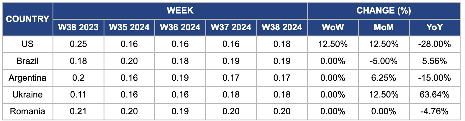 In W38, Romanian maize wholesale prices remained unchanged WoW but fell 4.76% YoY to USD 0.20/kg. This YoY price drop is due to early harvest results, which indicated quality issues and have led to several trades being "washed out" recently. As Europe's second-largest grain exporter after France, Romania is facing a significant drop in corn harvests due to one of the worst droughts in recent decades, affecting nearly 2 million ha of farmland. Corn output is expected to decline by 10 to 15% in the upcoming Oct-24 to Sept-25 season, raising concerns about tighter supply.
