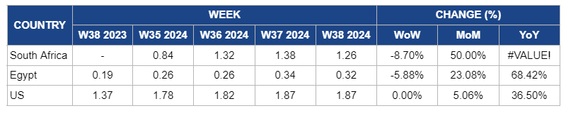 In W38, South Africa's orange prices decreased by 8.70% week-on-week (WoW) to USD 1.26/kg. This is due to an increase in domestic supply, as a significant portion of oranges could not be exported to the European Union (EU) due to stringent pest control regulations, leading to surplus volumes in the local market. Additionally, logistical challenges related to the mandated cooling treatments further disrupted export flows, intensifying the supply glut. However, month-on-month (MoM) prices increased by 50%, reflecting the lingering effects of earlier supply shortages and the impact of adverse weather conditions, which had previously constrained production and limited market availability.