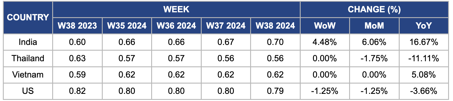 In W38, wholesale rice prices in India rose by 4.48% week-on-week (WoW), 6.06% month-on-month (MoM), and 16.67% YoY, reaching USD 0.70 per kilogram (kg). This price increase is primarily due to ongoing food inflation in India, which has remained around 8% YoY since Nov-23. Additionally, the government's recent removal of the minimum export price (MEP) for basmati rice has led to a surge in global inquiries, significantly boosting demand. As a result, basmati rice prices, which had previously declined due to reduced global orders, are rising.