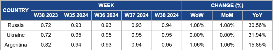 In W38, Russia’s sunflower oil prices rose slightly to USD 0.94 per kilogram (kg), marking an increase of 1.08% both week-on-week (WoW) and month-on-month (MoM). The YoY price increased 30.56% from USD 0.72/kg in W38 2023. This upward price trend is driven by a significant supply-demand imbalance from reduced raw material reserves and uncertain harvest conditions due to unfavorable weather. The ongoing decrease in Ukraine’s sunflower cultivation areas has compounded these challenges, further tightening the overall sunflower supply in the global market.