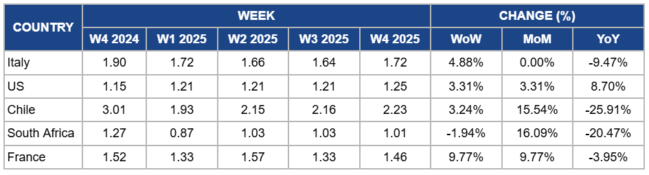 In France, apple prices increased by 9.77% WoW and MoM to USD 1.46/kg in W4 due to a seasonal reduction in supply, with improved quality and the availability of stored apples, which stimulated local and European market demand. The upward pressure on prices was further supported by stronger demand following the post-holiday season. However, YoY prices dropped slightly by 3.95% due to reduced demand and lower export volumes, particularly to third countries, reflecting the continued decline in exports compared to the previous year.
