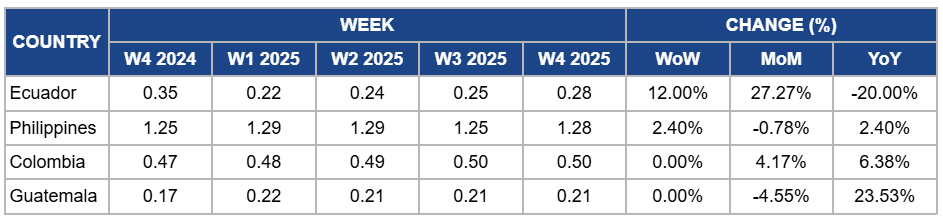 In W4, banana prices in Colombia remained steady at USD 0.50/kg, reflecting a 4.17% MoM increase and a 6.38% YoY increase due to sustained export demand from key markets like the United States (US) and Europe, driven by seasonal recovery. Favorable weather conditions supported consistent production, while reduced competition from other exporting countries and continued efforts to address logistical challenges helped maintain stable market dynamics. The YoY increase highlights improved market conditions and stronger export performance compared to the same period in 2024.