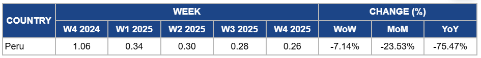 Mango prices in Peru fell by 7.14% week-on-week (WoW) to USD 0.26 per kilogram (kg) in W4, with a 23.53% month-on-month (MoM) decline and a 75.47% YoY drop due to continued overproduction, particularly in the Lambayeque region, which has contributed to an oversupply of mangoes in the market. Following the previous year's lower yields, this surplus has created a significant imbalance between supply and demand, further driving down prices. Additionally, the local prices have remained below production costs, prompting producers to abandon mangoes in the fields. Ongoing water shortages and early fruit ripening have compounded these challenges, intensifying the market pressure. The situation has been worsened by higher freight rates and delays in exports, which have further disrupted the Peruvian mango industry.