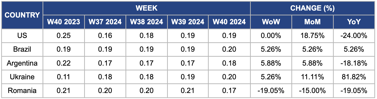 In W40, wholesale maize prices in the United States (US) remained unchanged week-on-week (WoW) but rose 18.75% month-on-month (MoM), reaching USD 0.19 per kilogram (kg). Key issues impacting the market include potential labor strikes at Gulf of Mexico ports, threatening to disrupt the agricultural supply chain and affect half of the country's ocean trade. Furthermore, low water levels on the Mississippi River are causing shipping delays and increased costs. Despite these challenges, prices are 24% lower YoY, mainly due to the United States Department of Agriculture's (USDA) upward revision of corn production and yield forecasts, estimating output at 15.186 billion bushels and an average yield of 183.6 bushels per acre, both higher than previous estimates. This improved production outlook contributes to a more favorable supply scenario, significantly impacting the YoY price decline.