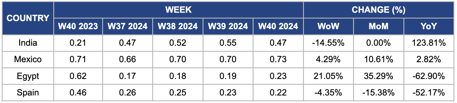 In W40, Egyptian onion prices rose to USD 0.23/kg, marking a 21% WoW increase and a 35.29% MoM rise. However, prices are still down by 62.90% YoY. The recent WoW and MoM price increases are due to constrained supply as the harvest season concludes, resulting in lower available volumes. The significant YoY price drop is due to an oversupply this season following last year's onion shortage and a temporary export ban. Egypt is also negotiating to open markets in emerging countries, which could boost demand and increase export prices in the coming months.Spain