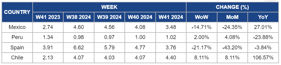 In Peru, avocado prices slightly increased by 2% WoW and 4.08% MoM in W41. The price increase is due to ongoing limited supply from primary producing regions like Lima and La Libertad, coupled with reduced exports from other Southern Hemisphere producers, keeping demand high. However, YoY prices declined significantly by 23.88% due to a slowdown in export volumes to major markets like Spain and the US, leading to lower overall market demand than last year.