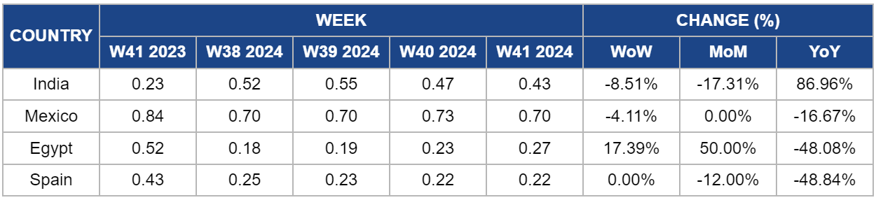 Egypt's onion wholesale prices rose significantly in W41, increasing by 17.39% WoW and 50% MoM to USD 0.27/kg. However, this represents a substantial YoY decline of 48.8% from USD 0.52/kg. The price rise follows the commencement of the Egyptian onion season in Apr-24, after a three-month export ban imposed due to last season's insufficient stocks, which had led to unprecedented local prices. Unfortunately, demand remains low, with producers reporting almost nonexistent interest in Egyptian onions, particularly from key markets like Saudi Arabia. This oversupply and diminished demand have led to falling prices compared to the previous season.