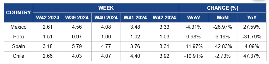 In Chile, avocado prices declined by 10.91% WoW to USD 3.92/kg in W42, with a 2.73% MoM decline due to a slight easing in export demand following the previous week's significant increase. Additionally, the market experienced increased competition from Colombian avocados, which have gained traction in Europe, potentially affecting Chile's pricing strategy. However, YoY prices increased by 47.37% due to sustained high export demand, reduced supply from competing Southern Hemisphere producers, and ongoing investments in port infrastructure that have enhanced Chile's export capacity, driving the overall price up despite recent fluctuations.