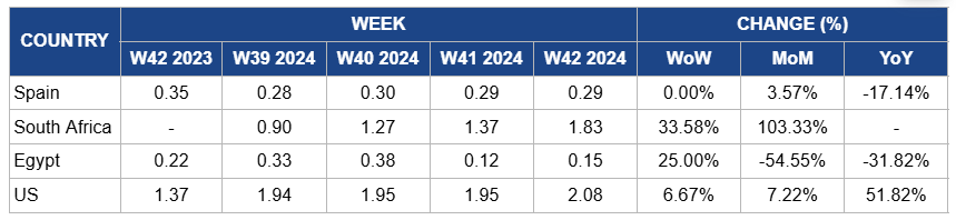 In South Africa, orange prices surged by 33.58% week-on-week (WoW) to USD 1.83/kg in W42, with a 103.33% MoM increase. This significant rise is due to heightened local demand due to the ongoing concerns over phytosanitary issues affecting exports, particularly the request from Intercitrus for stricter EU measures on South African imports. These developments have generated uncertainty in the export market, prompting local producers to focus on domestic sales. As a result, the increased demand for local oranges has driven prices higher. However, potential regulatory challenges and pest detections in shipments could create market fluctuations in the near future, impacting the sustainability of these price levels.
